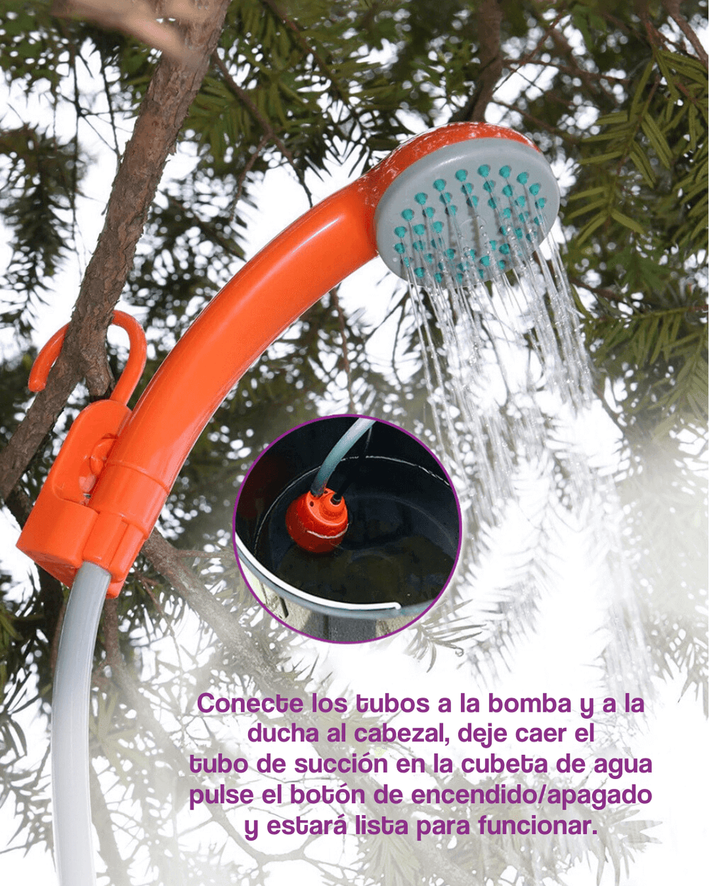 Conecte los tubos a la bomba y a la ducha para el cabezal, conecte el cargador en  el auto, deje caer el tubo de succión en la cubeta de agua, pulse el botón de encendido/apagado y estará lista para funcionar.