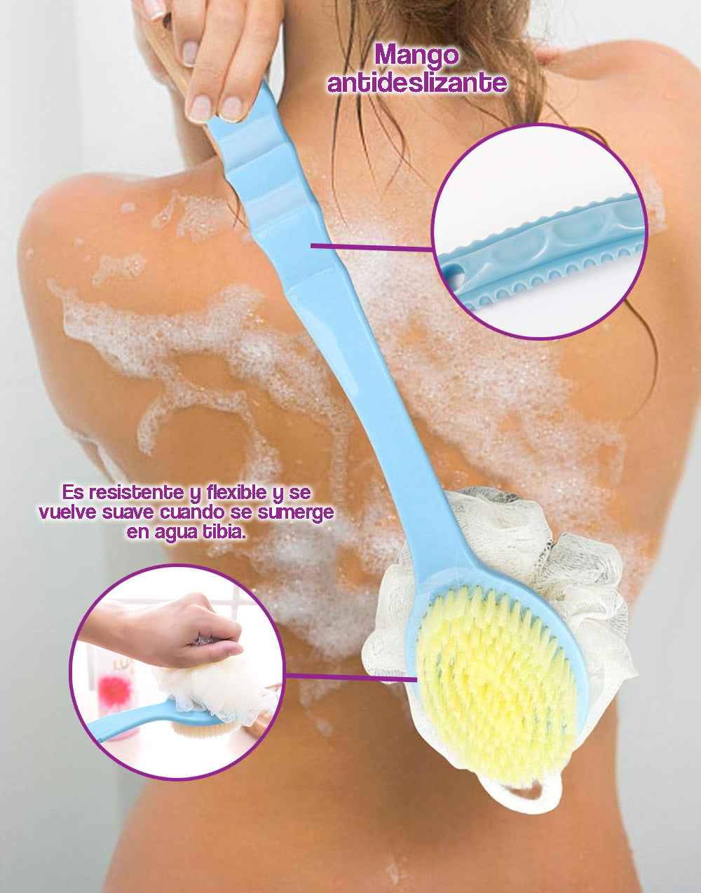 Cepillo con mango largo por lo que es fácil lavar y masajear tu espalda. Malla densa y ampolla más rica para lograr un baño cómodo. Masajea el punto convexo, relaja los canales musculares, alivia la fatiga.El mango se ajusta al diseño ergonómico, es ligero y muy cómdo para utilizar durante una relajante ducha.