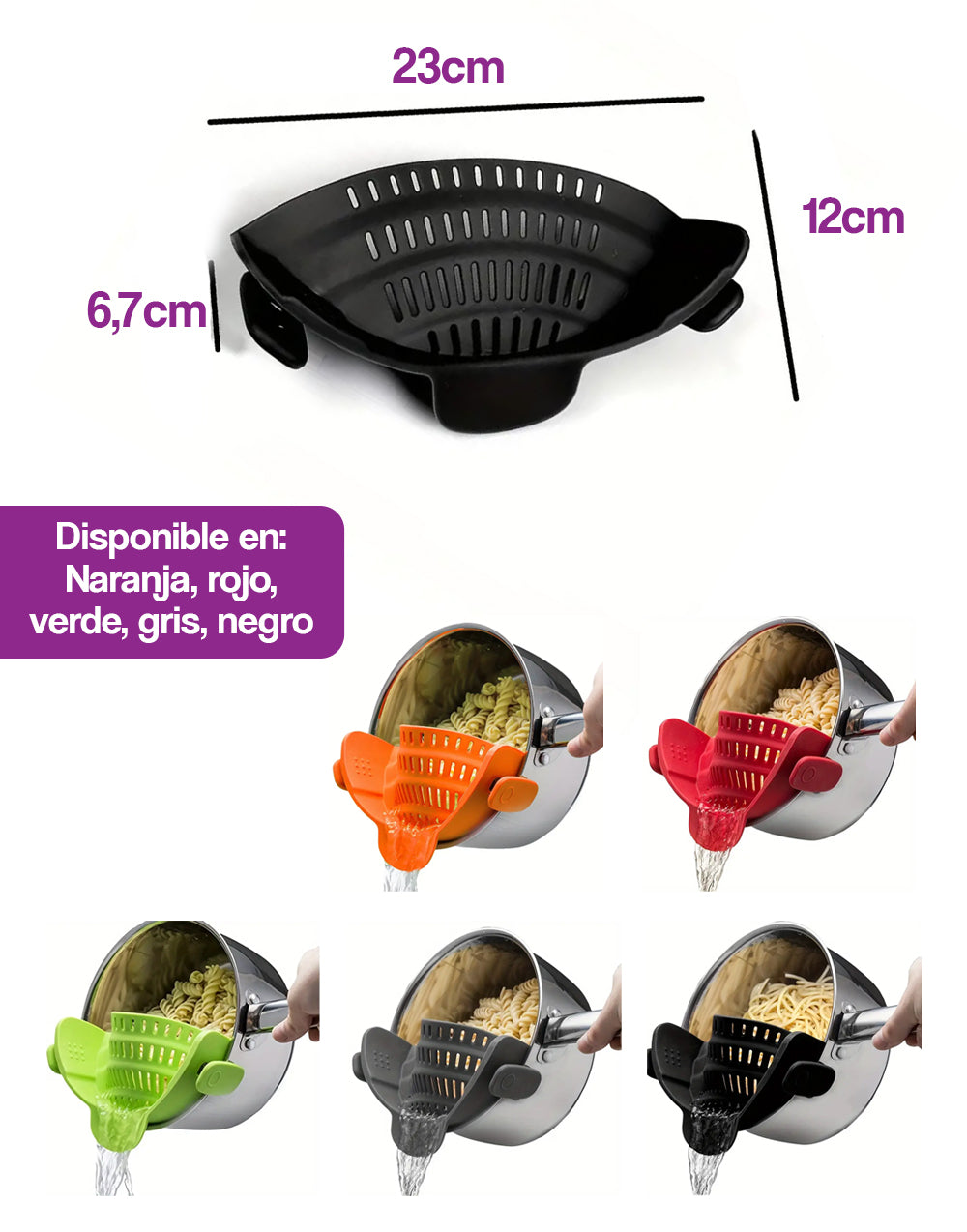 Está diseñado con dos clips fuertes para adaptarse de forma segura a cualquier tazón o sartén. Su tamaño compacto le permite caber en espacios de cocina más pequeños, mientras que la construcción robusta lo convierte en una herramienta confiable para cualquier cocina. Es perfecto para drenar una variedad de alimentos rápidamente y sin ensuciar.