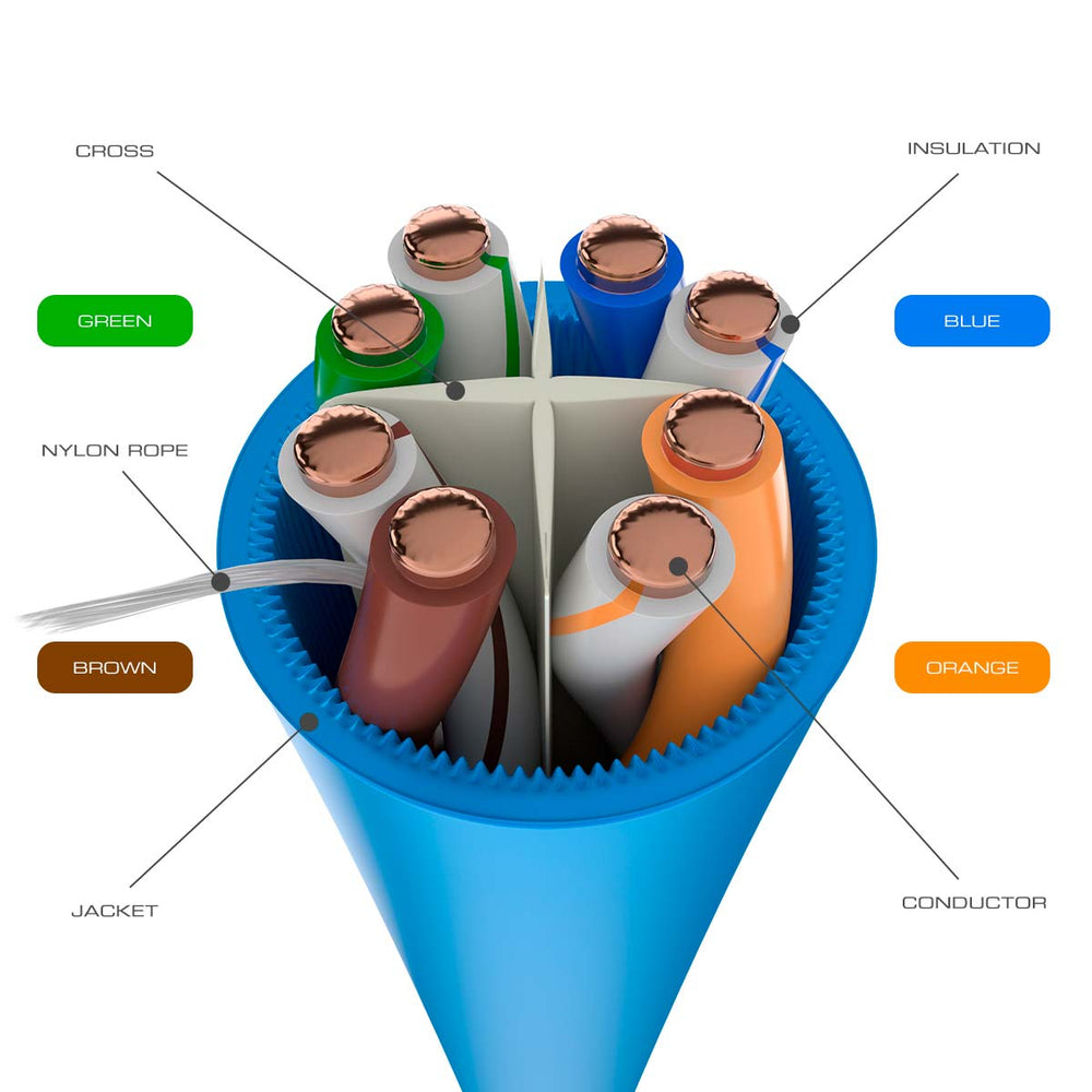 - Construcción: 4 pares trenzados sin blindaje (U/UTP), Conductores sólidos de cobre, Dieléctrico de espuma de polietileno