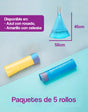 Saca la basura con confianza con estas bolsas con cordón, construida con plástico más grueso en la parte inferior para garantizar la protección contra fugas. Dsisponible en color Azul y manigueta color rosado, Amarillo y manigueta color celeste