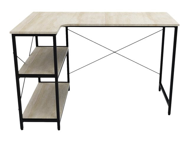 Escritorio en L de un nivel para computadora con estantes que ofrece un área de trabajo cómoda y espaciosa